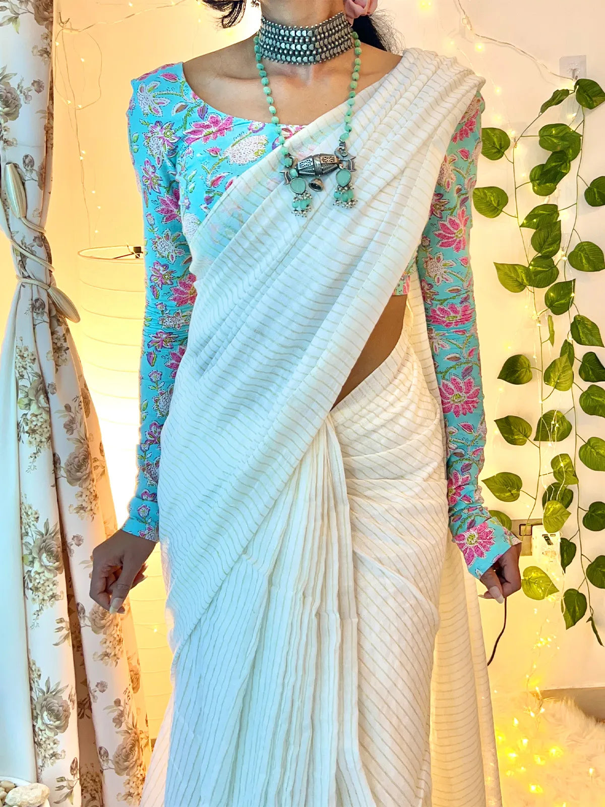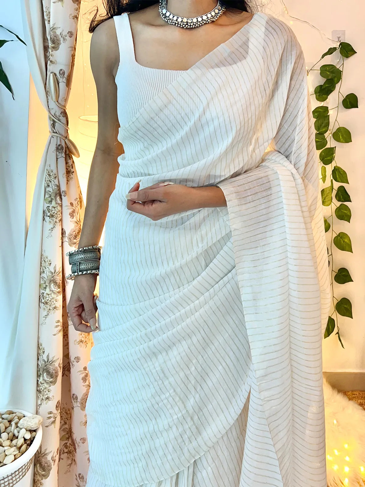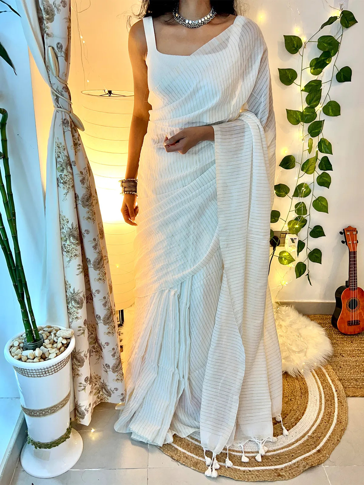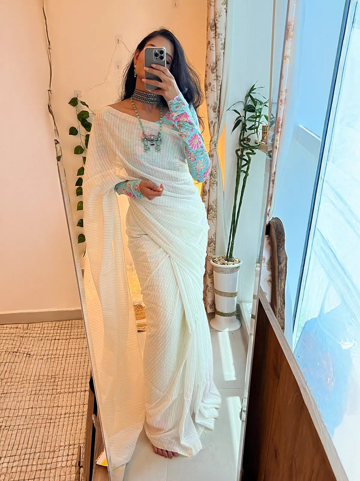A graceful cotton saree featuring elegant zari stripes, blending simplicity with a touch of shimmer. Lightweight and timeless, itβs perfect for both everyday elegance and festive moments.