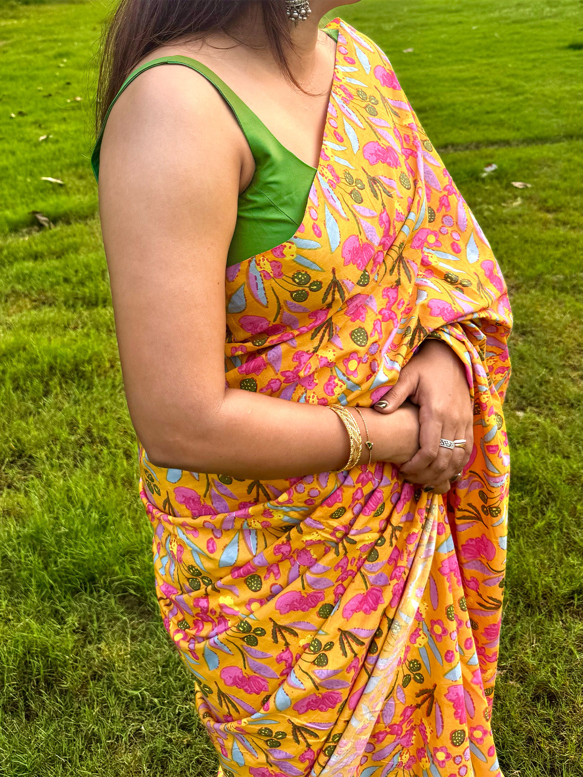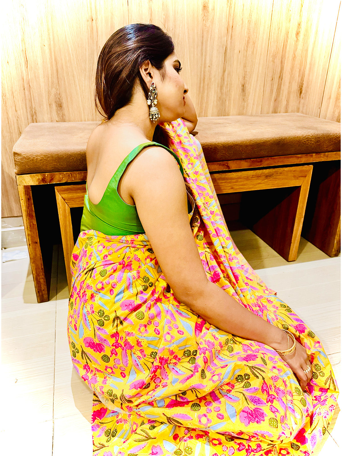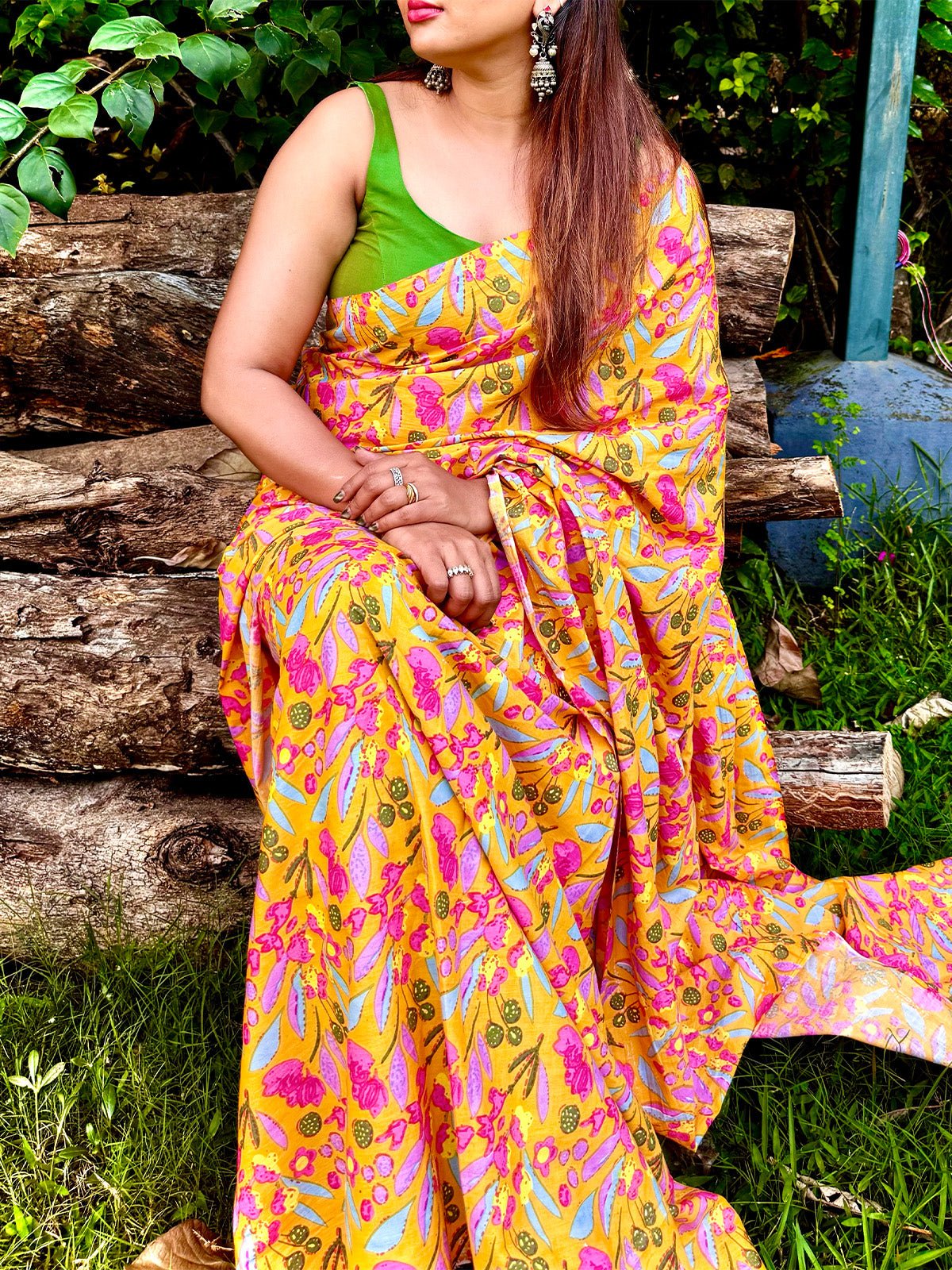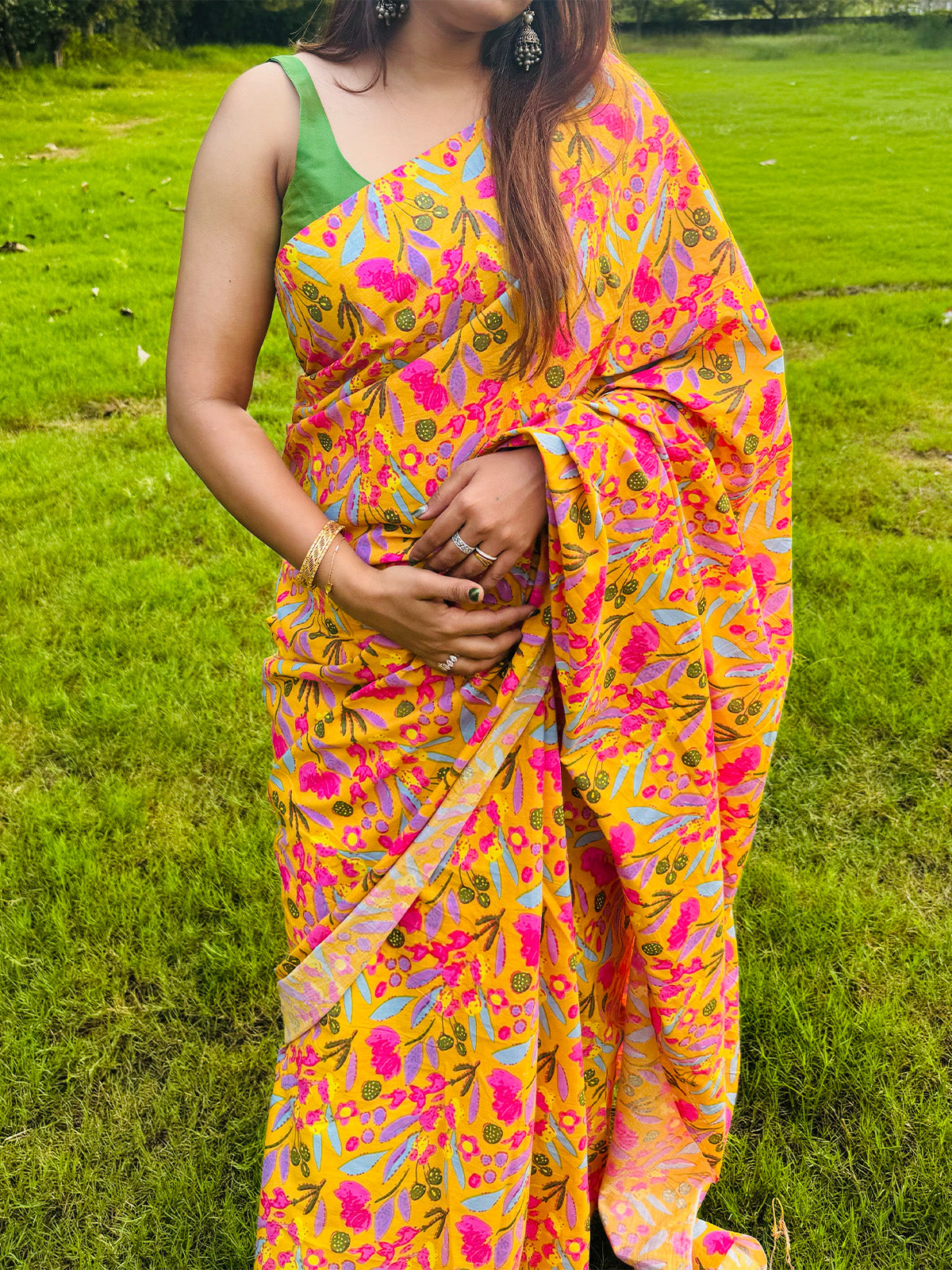 A lively yellow saree adorned with bold pink floral prints and soft pastel accents, paired with a vibrant green blouse. Its playful color palette and breezy fabric make it the perfect choice for daytime celebrations or casual gatherings.