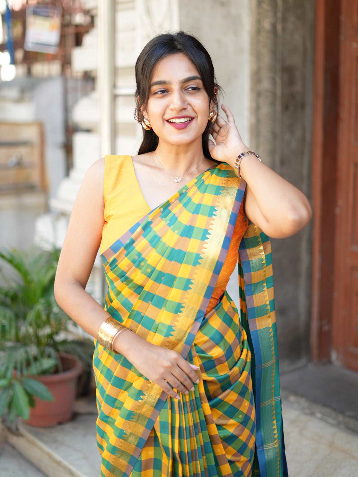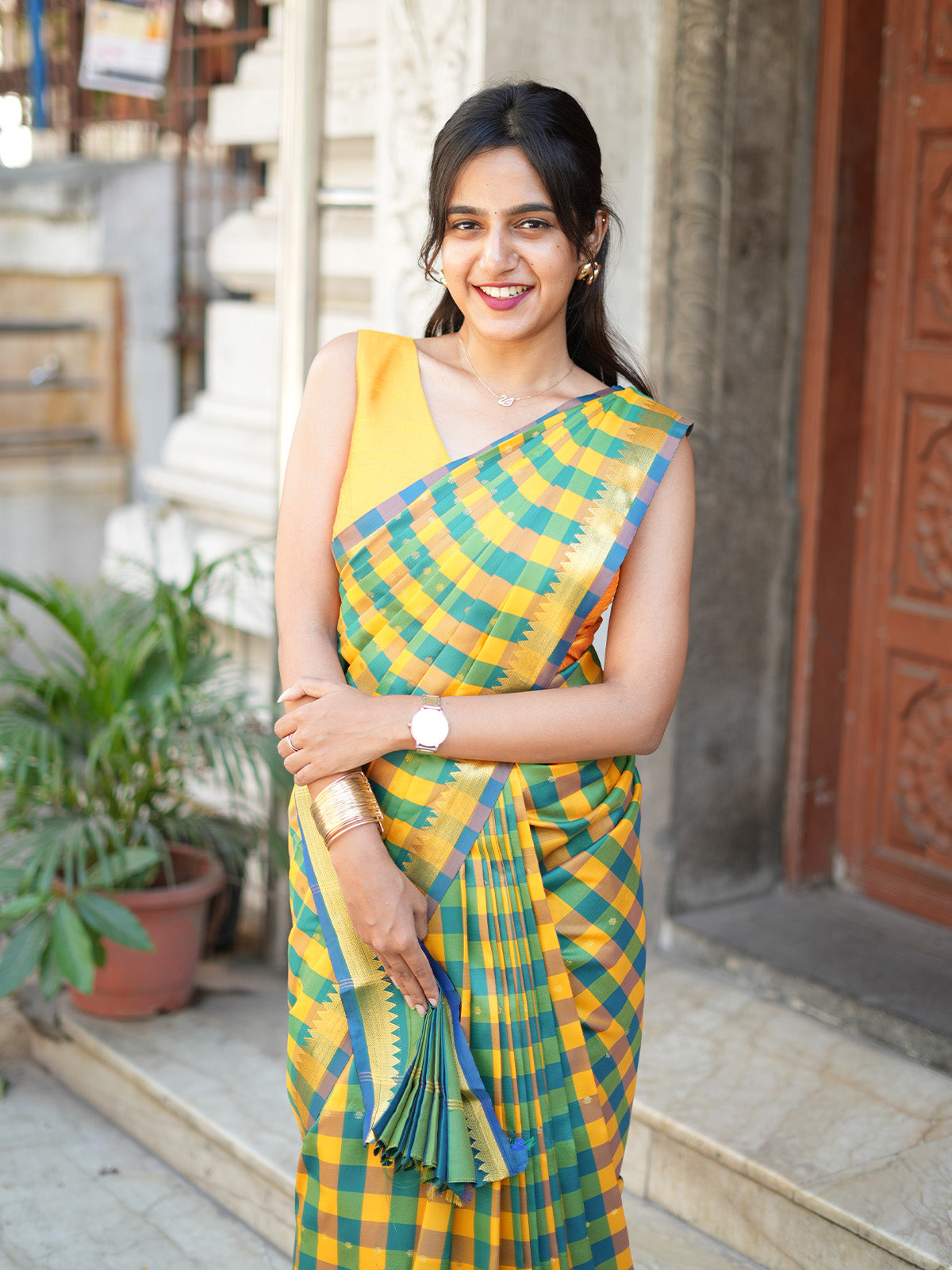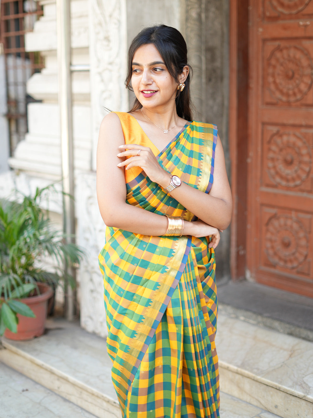 A vibrant yellow and green checked saree with a golden zari border that radiates festive cheer. Paired with a solid mustard blouse, it blends traditional charm with a fresh, youthful vibe—perfect for temple visits, cultural events, or daytime celebrations.