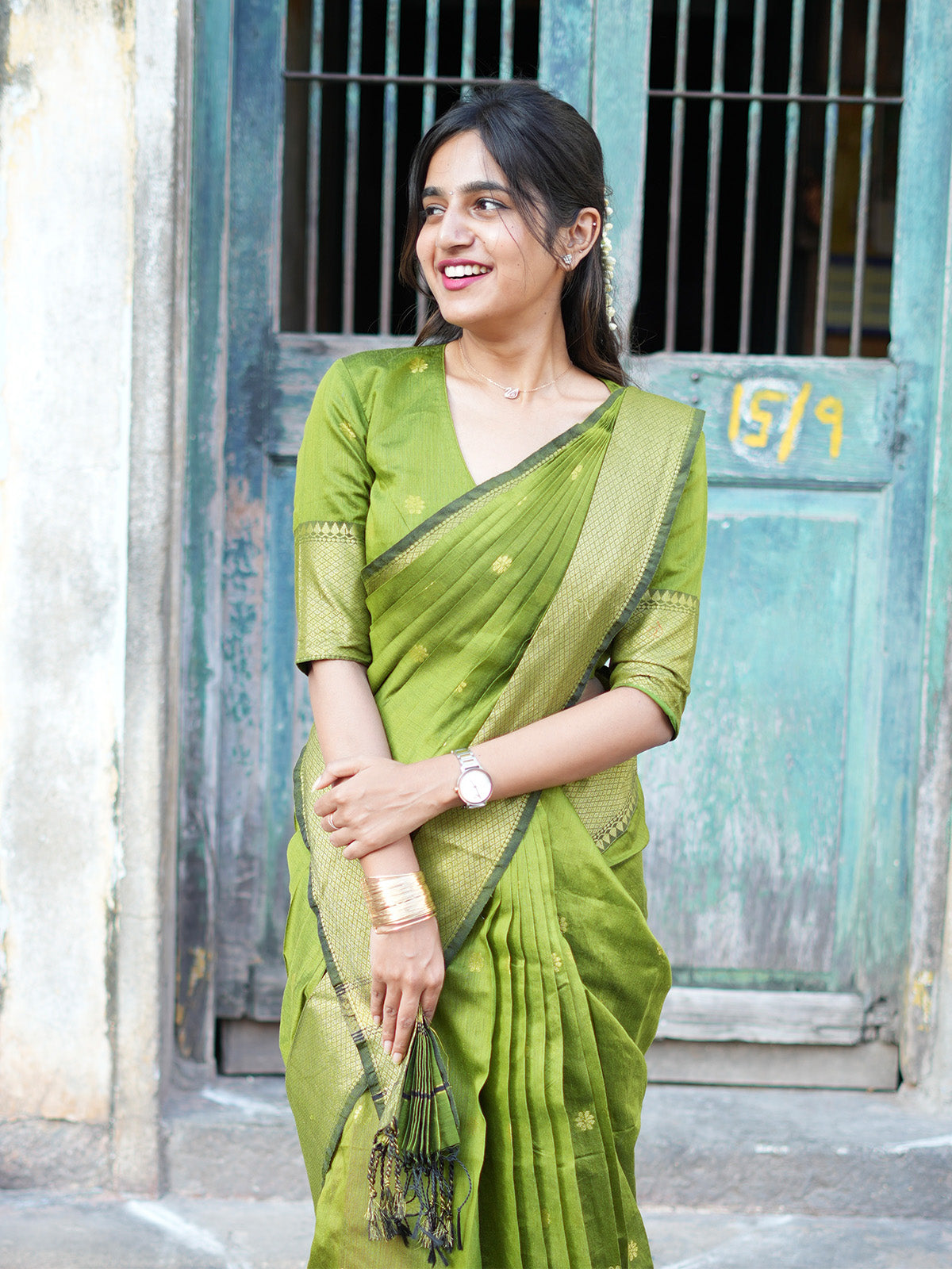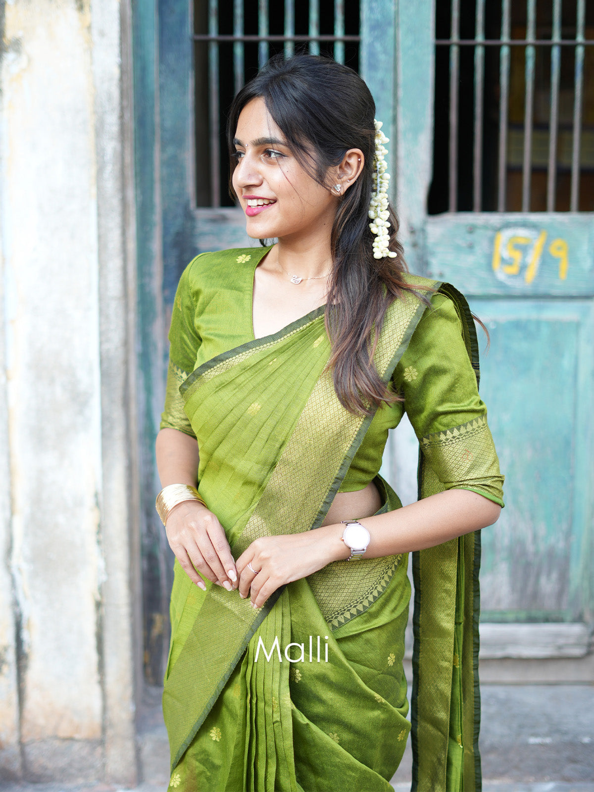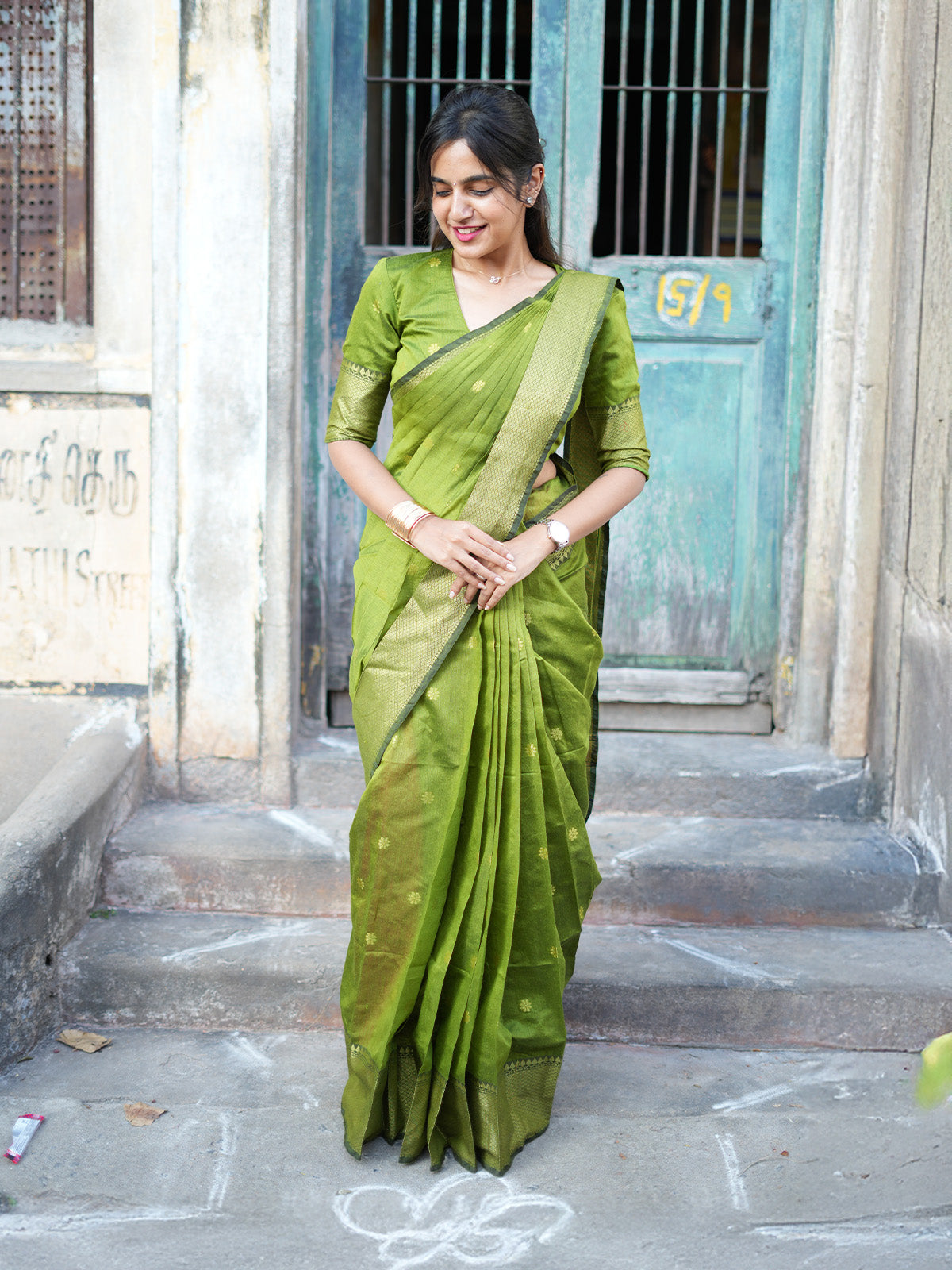 A beautifully understated olive green saree with intricate golden thread work and a delicate zari border. Paired with a matching blouse, this ensemble blends sophistication and tradition effortlessly. Ideal for festive occasions, formal gatherings, or cultural celebrations, this look is timeless yet fresh.