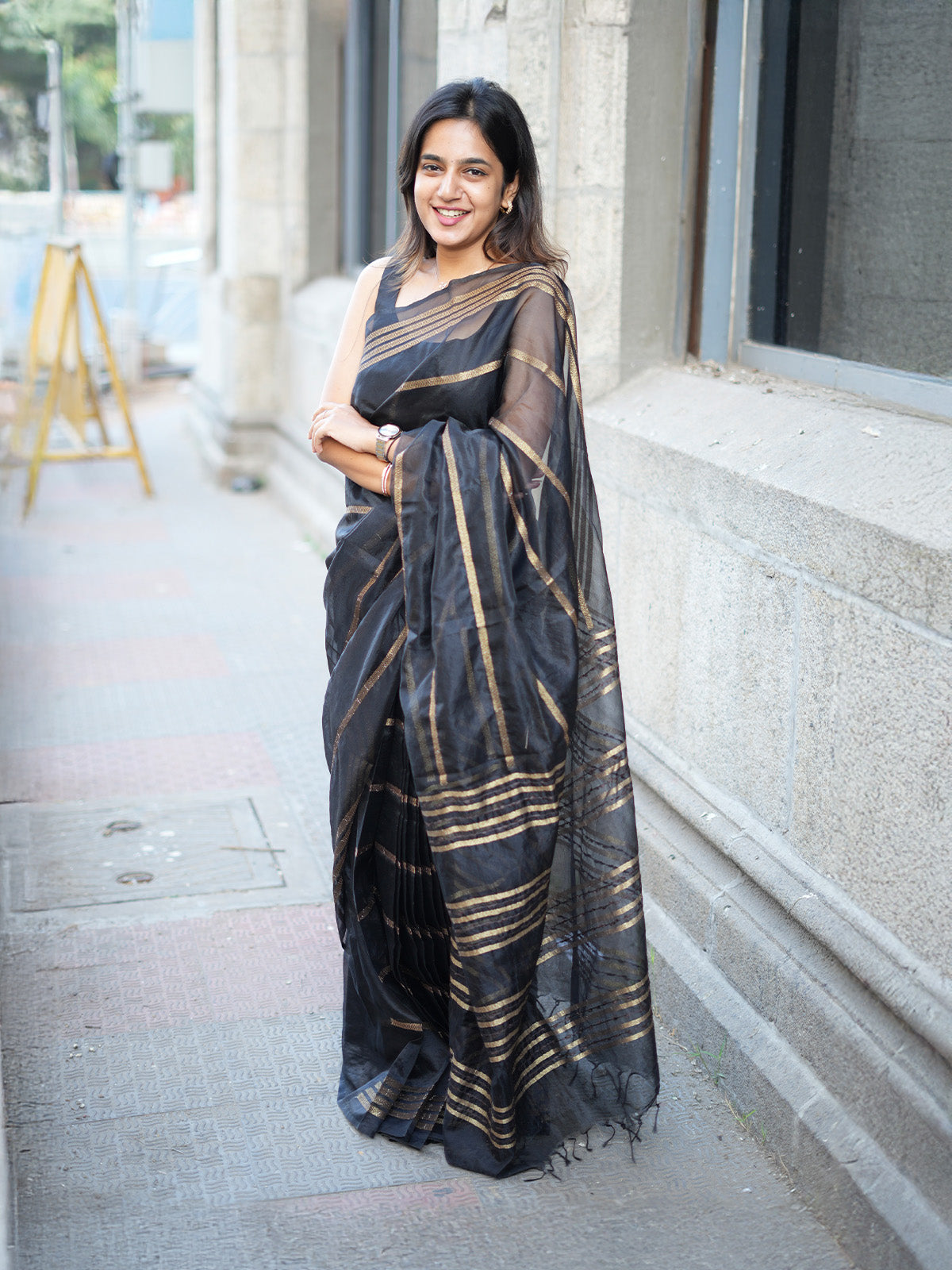 An effortlessly elegant black saree featuring delicate golden striped detailing—this look is a masterclass in minimal sophistication. Perfect for formal evenings, festive affairs, or intimate celebrations, it radiates quiet confidence and traditional charm.