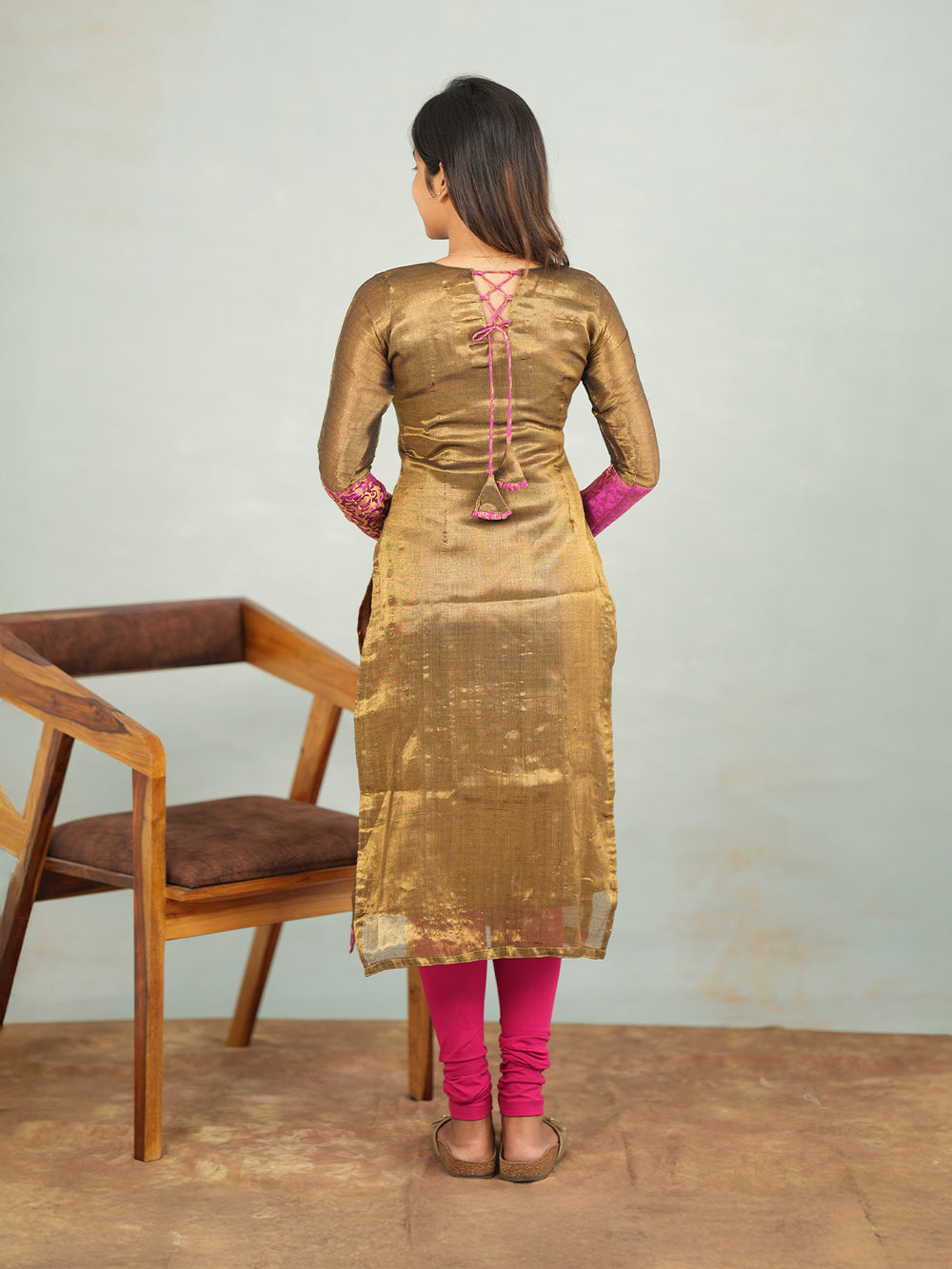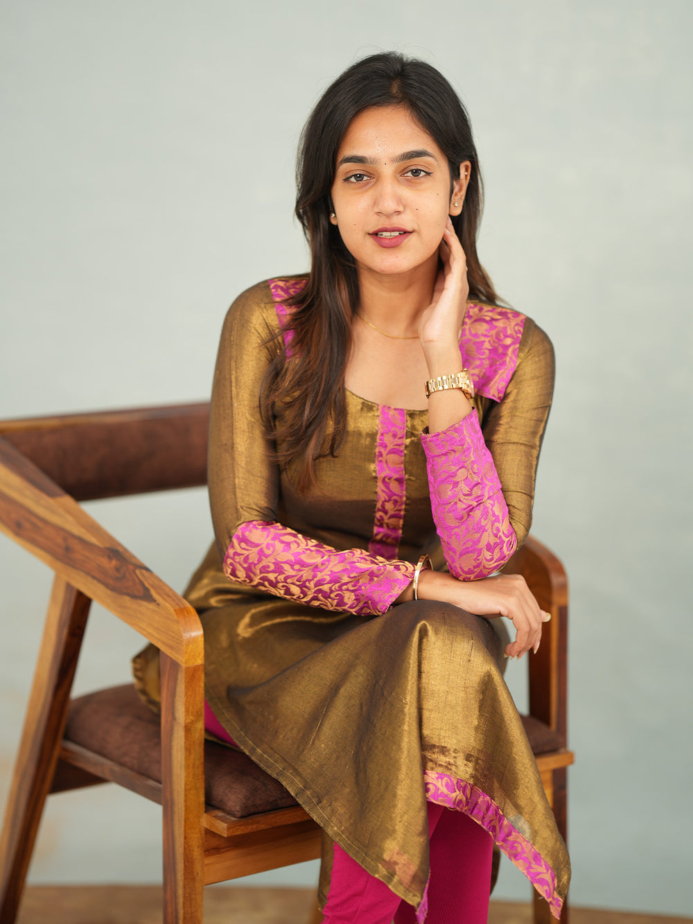 A rich brown kurta with striking pink brocade accents that add a pop of vibrance. Its sleek silhouette and elegant detailing make it perfect for festive gatherings or sophisticated daywear.