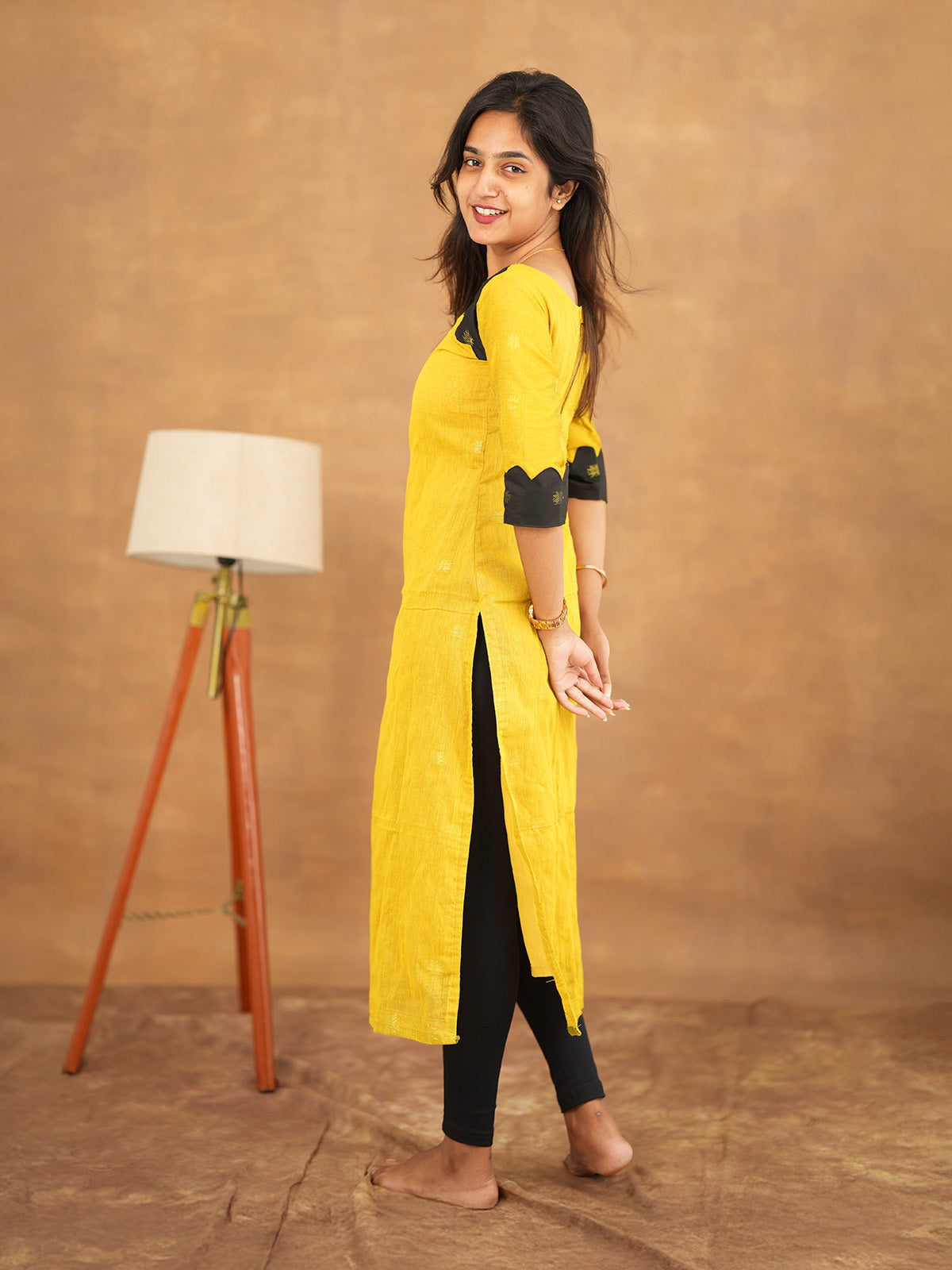 A vibrant mustard yellow kurta with subtle embroidered patterns and contrasting black accents. The chic neckline cutout and minimal detailing make it a versatile choice for casual outings or semi-formal gatherings.